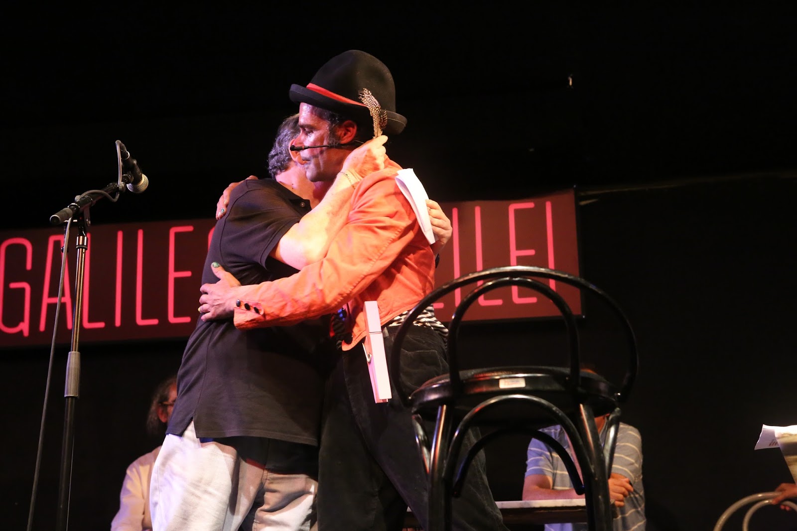 Como a lo largo de toda la fiesta, los diferentes grupos de creadores permanecieron en el escenario escuchando y disfrutando del canto y de la música de sus compañeros y compañeras. En esta foto ADOLFO CELDRÁN, CHIQUI CALDERÓN y yo, mismamente. |