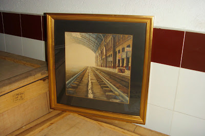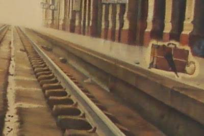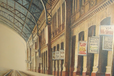 El cuadro de Máximo nos ofrecía una preciosa y muy realista imagen de una estación de ferrocarril de la España de los setenta dentro de la que destacan pequeños "guiños", o detalles, que me siguen llamando la atención: El dibujo de una maleta atada con una cuerda, de un botijo y de un paraguas –alusión directa a la más cruda emigración–; o unos carteles publicitarios, entre ellos dos en los que se dice "Vota sí" y "Vota no" –clara referencia a las primeras Elecciones Generales celebradas el 15 de junio de 1977–; un cartel en el que se destaca que la canción "Nana al niño emigrante" había sido ganadora del "XII Festival de la Canción de Alhama", en Granada; y, curiosamente, una placa, situada a la derecha del cuadro con la firma de su autor: "VÍA Máximo Moreno".